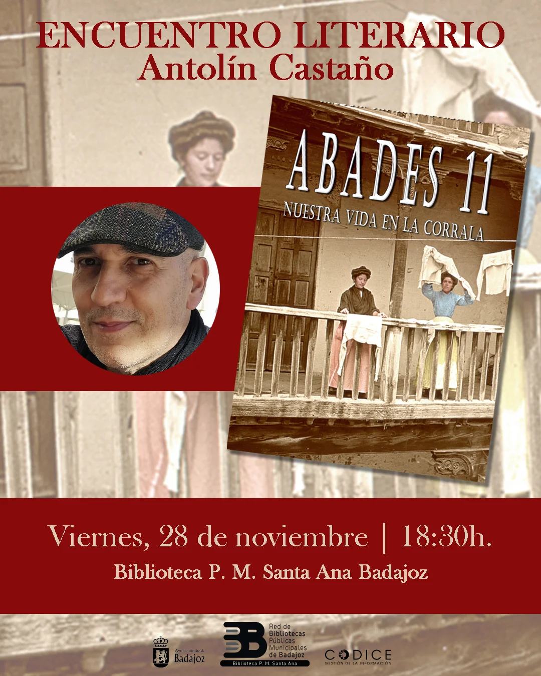 La Biblioteca Pública Municipal Santa Ana acogerá el próximo viernes 28 de noviembre a las 18:30 h. la presentación de la novela Abades 11, del escritor Antolín Castaño. Una cita literaria imprescindible para quienes disfrutan de la lectura y de la historia y costumbres de nuestro país.